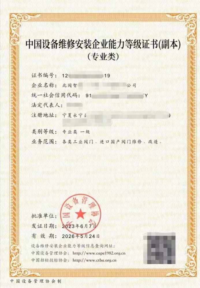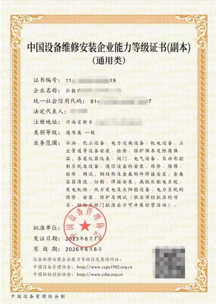中国设备维修安装企业能力等级证书是由中国设备管理协会颁发的对企业设备维修、安装的能力等级评定,可用于招投标或承接相关项目工程,提升公司的影响力,是公司实力的象征。